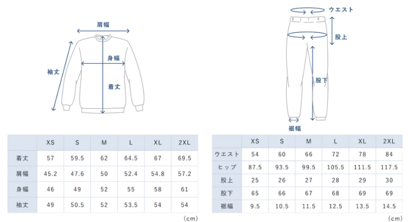 トップスはゆったりめの身幅と肩幅、パンツはゴム仕様のウエストと動きやすい股下で構成されており、着心地の良さが魅力です。