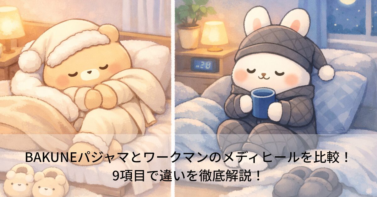 この記事ではBAKUNE(バクネ)パジャマとワークマンのメディヒールの違いを9つの観点から比較しています。